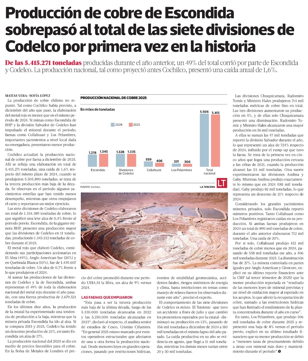 Producción de cobre de Chile cae casi 2% en 2025 y Escondida por sí sola superó a todas las divisiones de Codelco - (Diario Financiero)