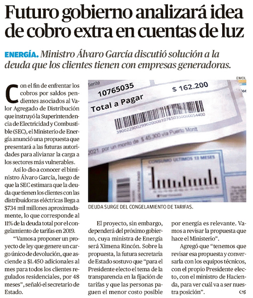 Gobierno aclara proyecto para pagar deuda con distribuidoras y futura ministra de Energía revisará la propuesta - (Diario Financiero)