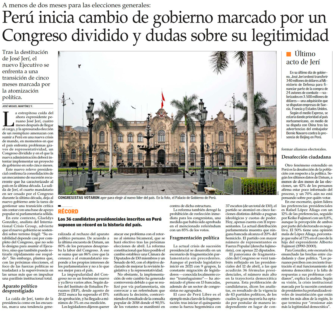 Tras la salida de Jose Jeri, expertos prevén impacto económico acotado en Peru - (Diario Financiero)