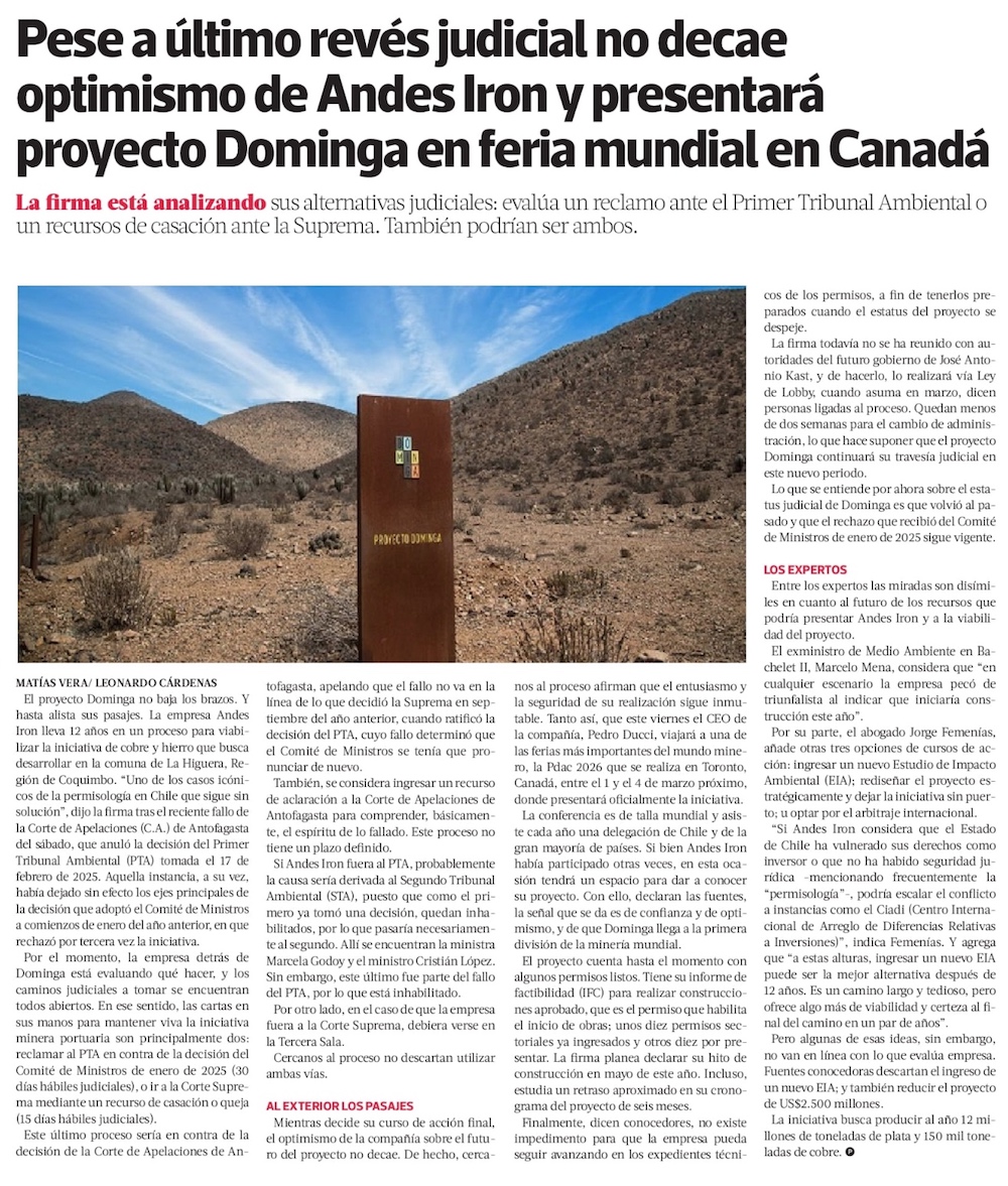 Andes Iron evalúa cuatro caminos Legales para Dominga y construcción se atrasaría seis meses - (Diario Financiero)