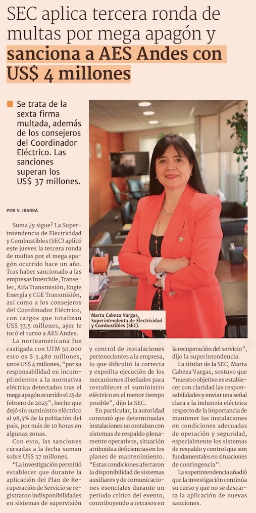 SEC sanciona con US$ 4 millones a AES Andes, por responsabilidad en el mega apagón de 2025 - (El Mercurio de Santiago)