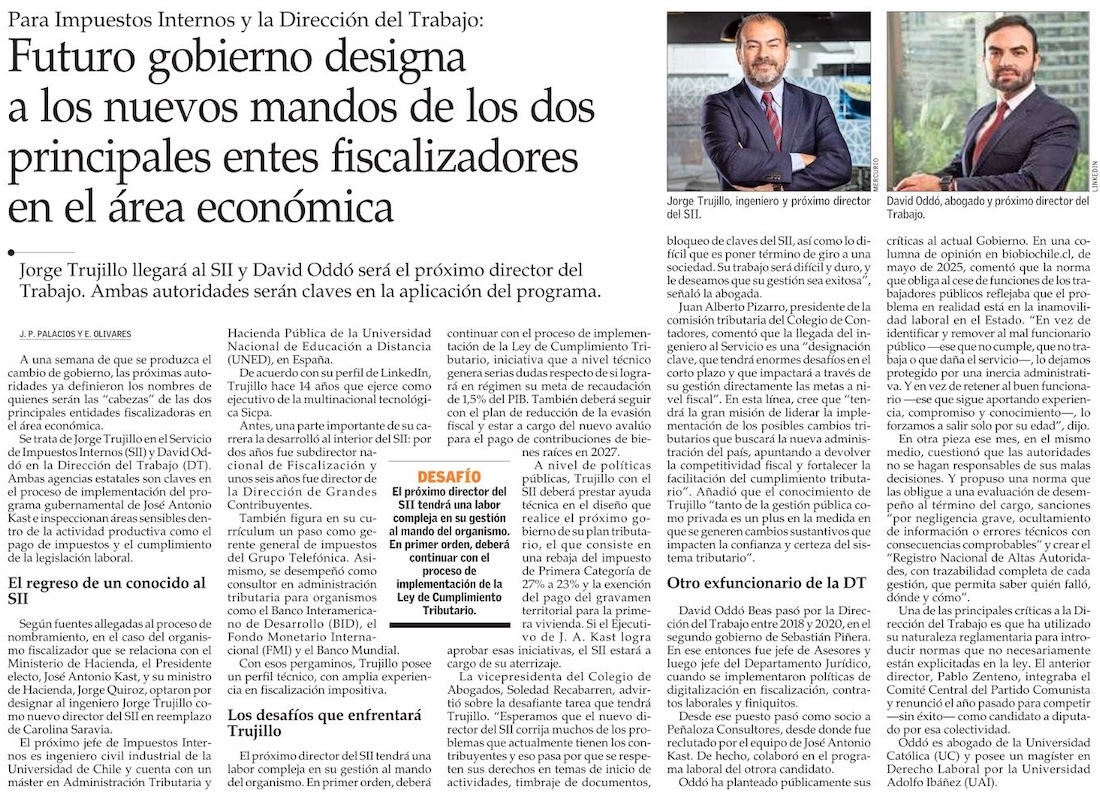 Humo blanco: Kast y Quiroz definen al nuevo director del SII y al coordinador tributario de Hacienda - (Diario Financiero)