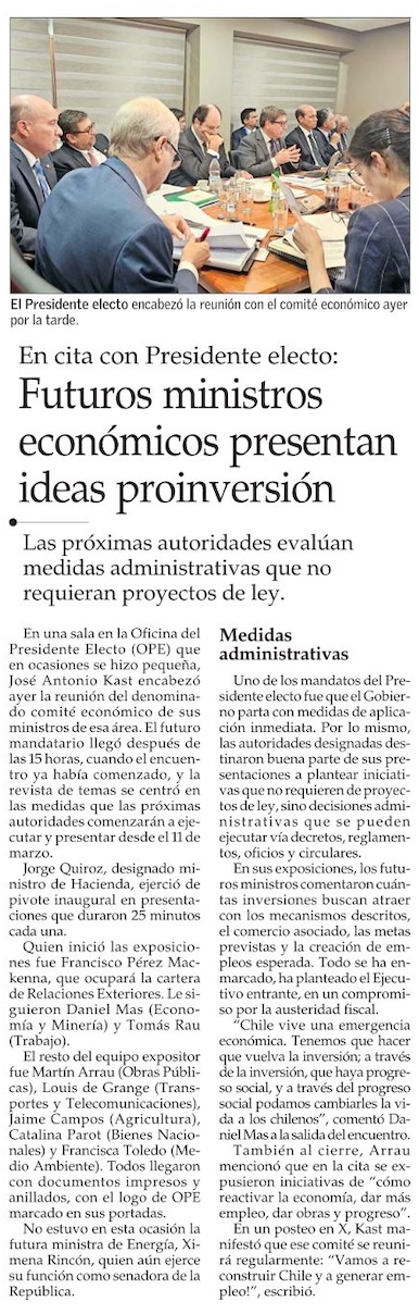 Kast ocupa dos “balas de plata” para el SII y la DT, y realiza primer “gabinete” económico para delinear hoja de ruta - (Pulso)