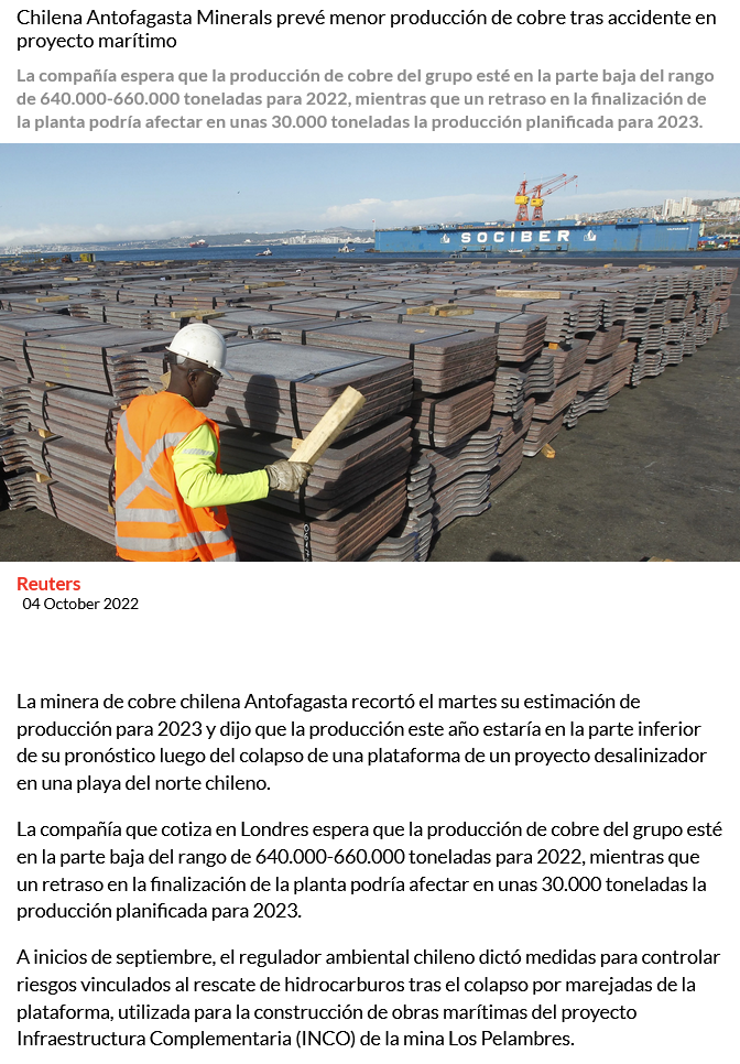 Minera de Luksic prevé menor producción de cobre en 2023 tras incidente en obras de desaladora Los Pelambres - (emol)