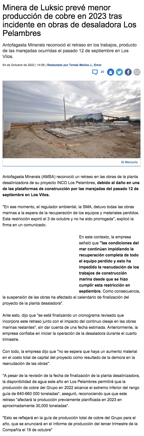 Chilena Antofagasta Minerals prevé menor producción de cobre tras accidente en proyecto marítimo - (americaeconomia online)