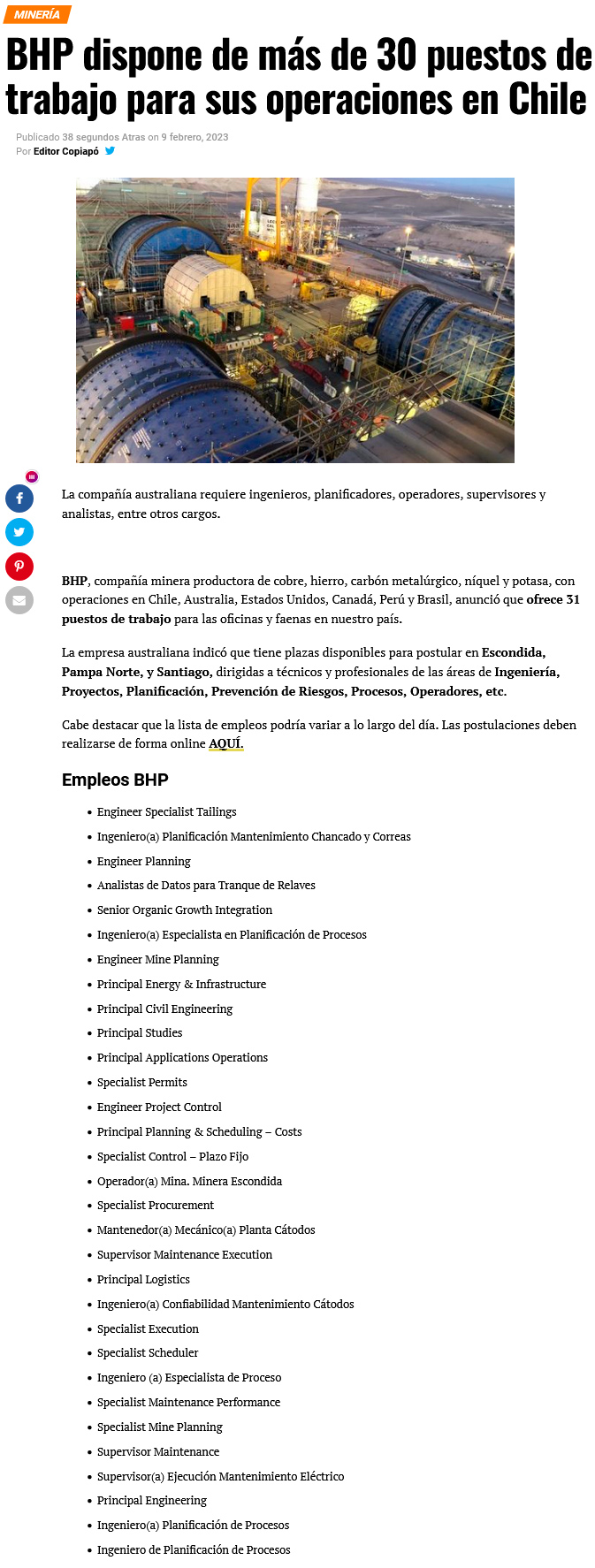 BHP lanza convocatoria para buscar soluciones de energía limpia en el transporte de personas - (revistaei.cl)