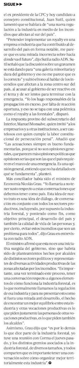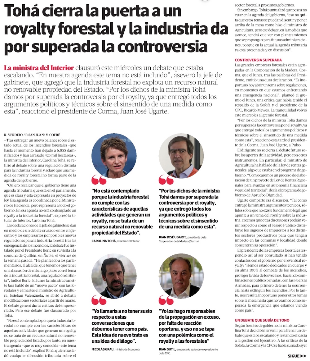 Ministerios de Interior y Hacienda descartan propuesta de royalty para la industria forestal - (El Mercurio de Santiago)