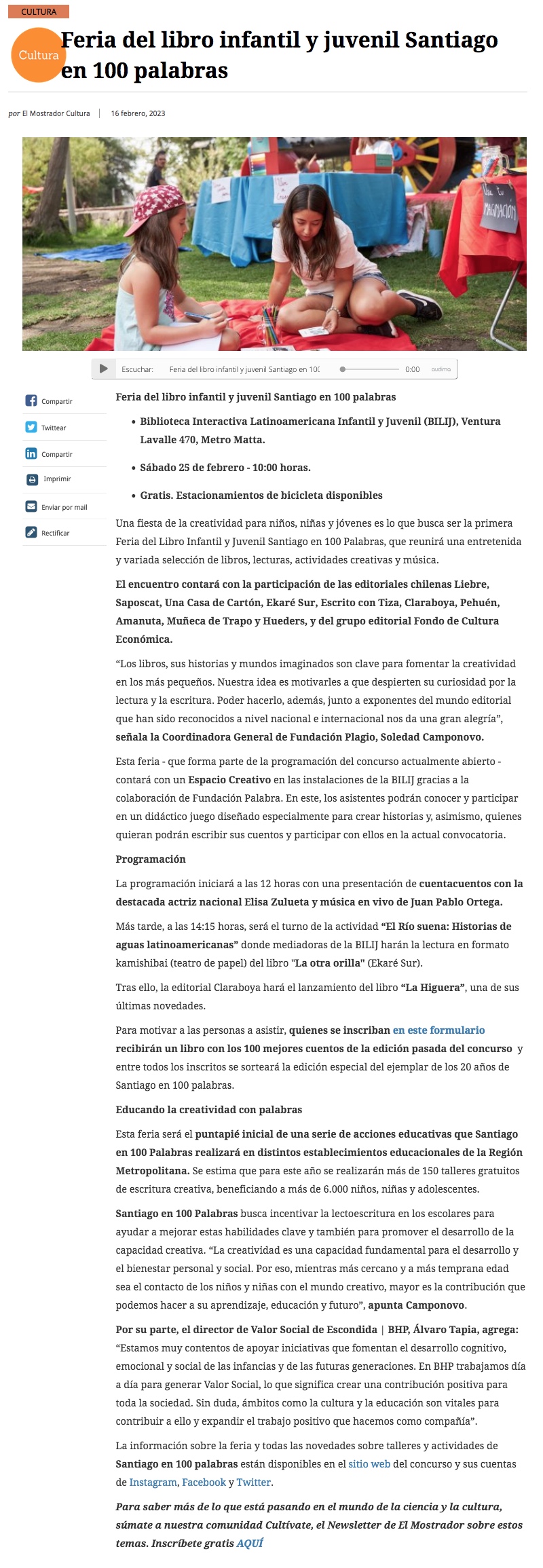 Panorama familiar de verano: Santiago en 100 palabras anuncia nueva Feria del Libro Infantil y Juvenil para estimular el espíritu creativo de niñas y niños - (radioallen.cl)