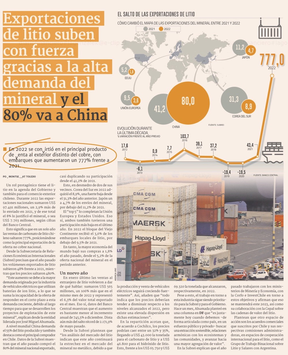 Boom del litio da un gran impulso a las exportaciones chilenas y el 80% se destina a China - (DF Online)