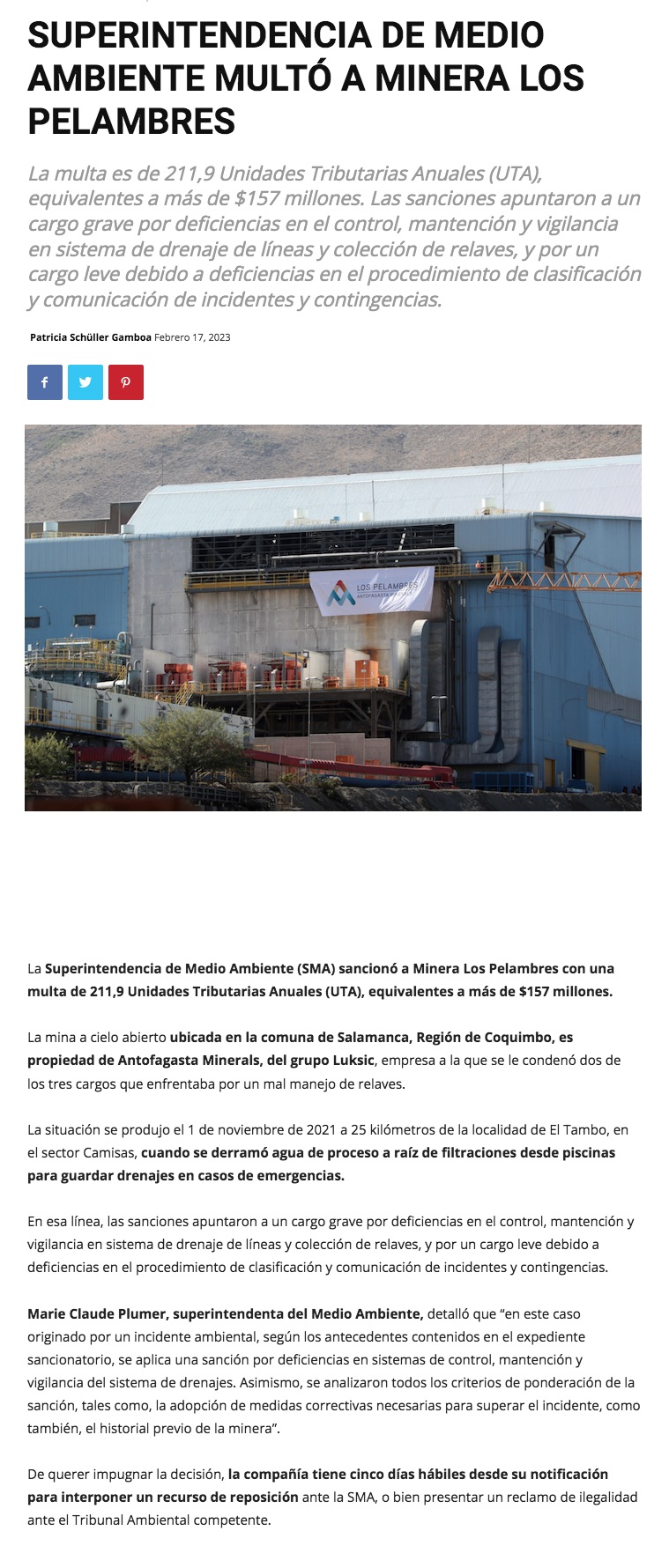 SMA aplica multa a minera Los Pelambres tras incidente en manejo de relaves - (La Región)