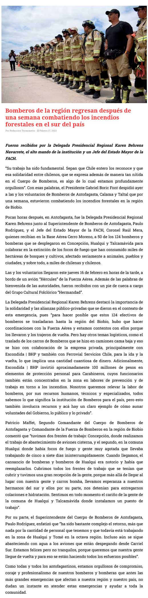Bomberos de la región regresan después de una semana combatiendo los incendios forestales en el sur del país - (diarioantofagasta)