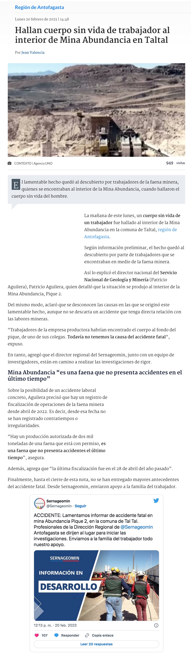 Trabajador boliviano de 31 años fallece tras sufrir caída en pique minero en Taltal - (El Mercurio de Antofagasta)