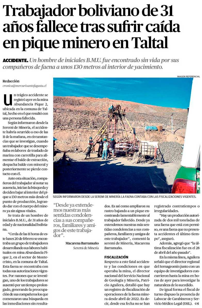 Hallan cuerpo sin vida de trabajador al interior de Mina Abundancia en Taltal - (biobiochile online)