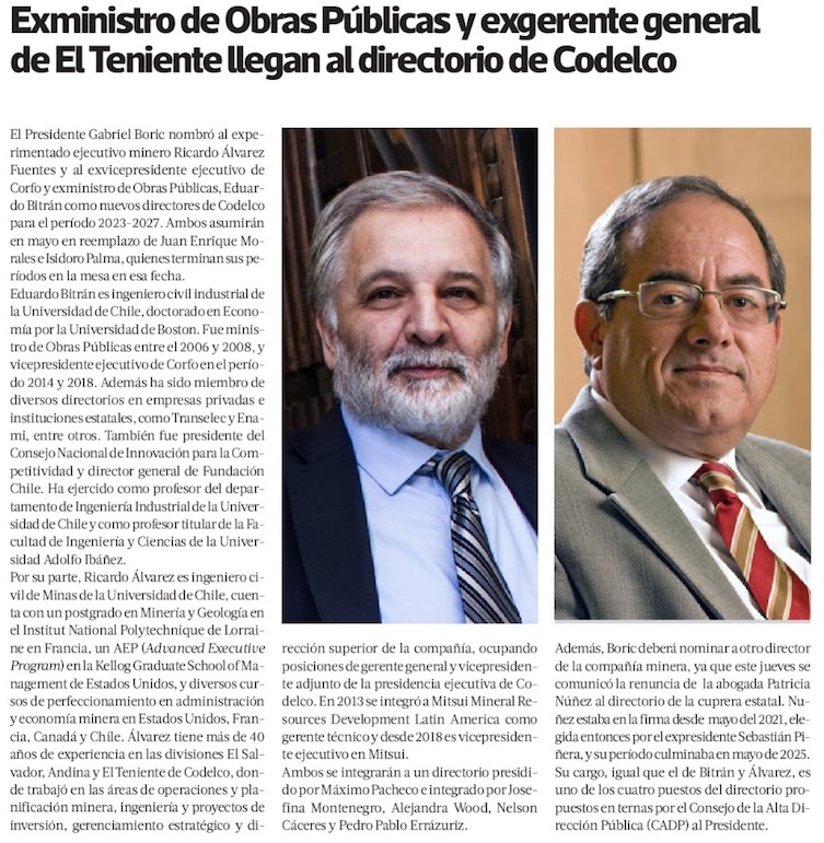 Jefe de Estado nomina a Eduardo Bitran y Ricardo Álvarez como nuevos directores de Codelco - (El Mercurio de Santiago)