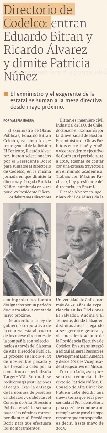 Jefe de Estado nomina a Eduardo Bitran y Ricardo Álvarez como nuevos directores de Codelco - (El Mercurio de Santiago)
