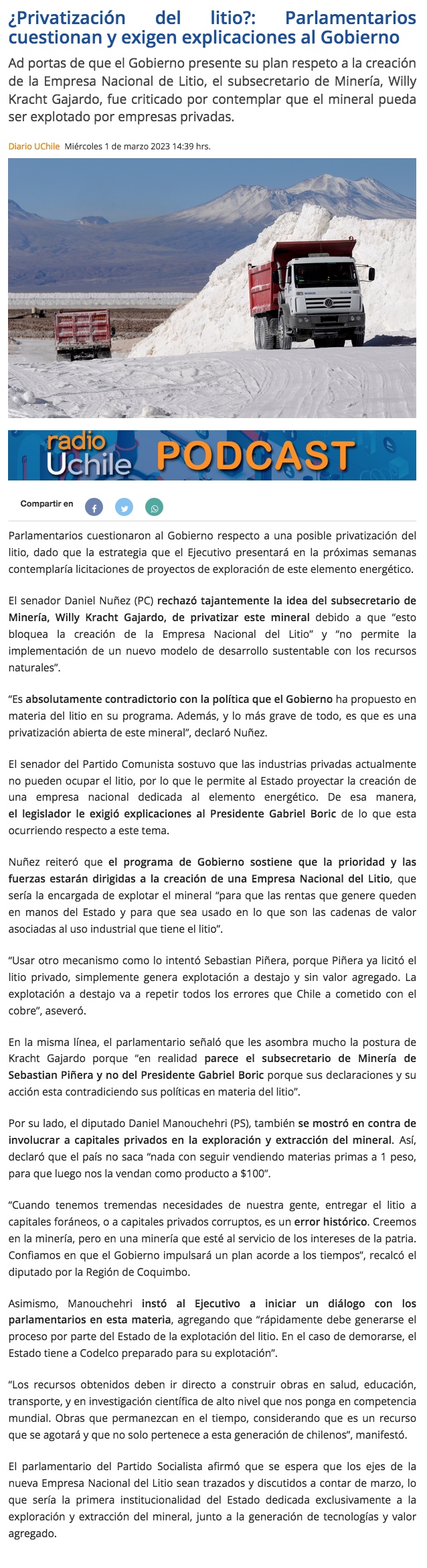 Parlamentarios de la zona, Manouchehri y Núñez, cuestionan posible privatización del litio: “Sería un error histórico” - (La Región)