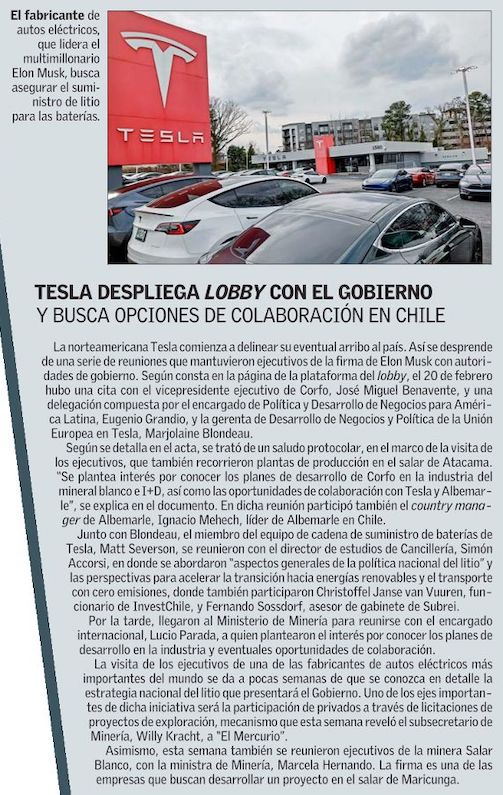Tesla activa lobby por litio en Chile: gigante liderada por Elon Musk se reúne con Corfo, Minería y Cancillería, y anuncia visita a plantas de producción - (Pulso)