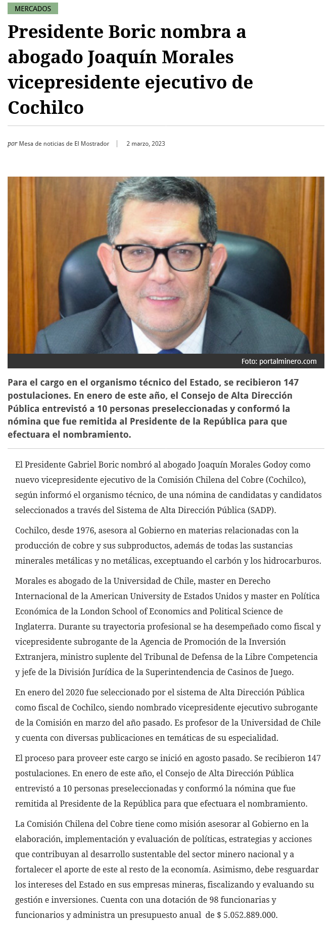 Designan a JoaquĆn Morales en Cochilco - (El Mercurio de Santiago)