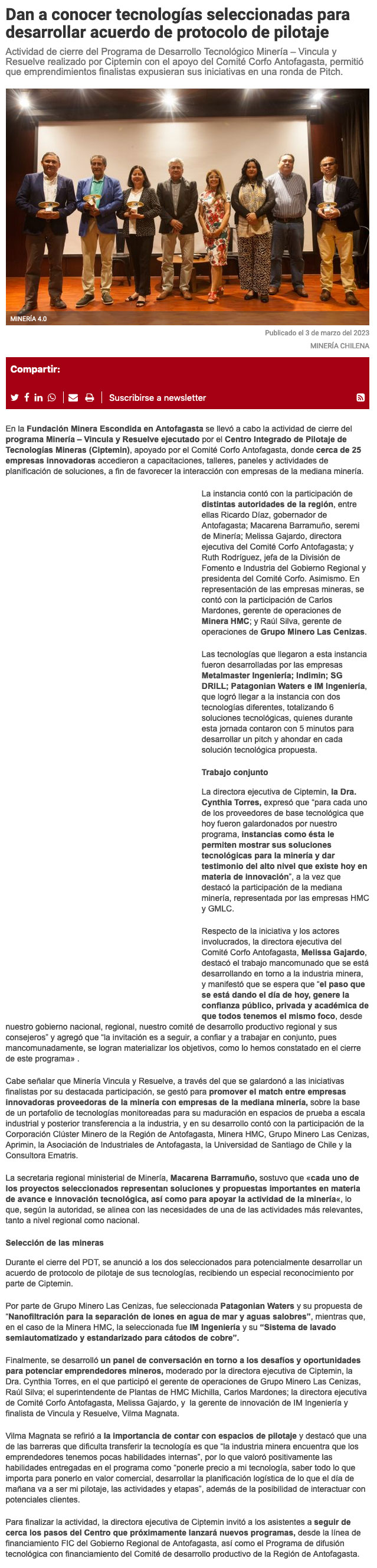 Elegidas por Grupo Minero Las Cenizas y HMC: Vincula y Resuelve finaliza y dan a conocer tecnologías seleccionadas para desarrollar un acuerdo de protocolo y pilotaje - (antofagastanoticias)