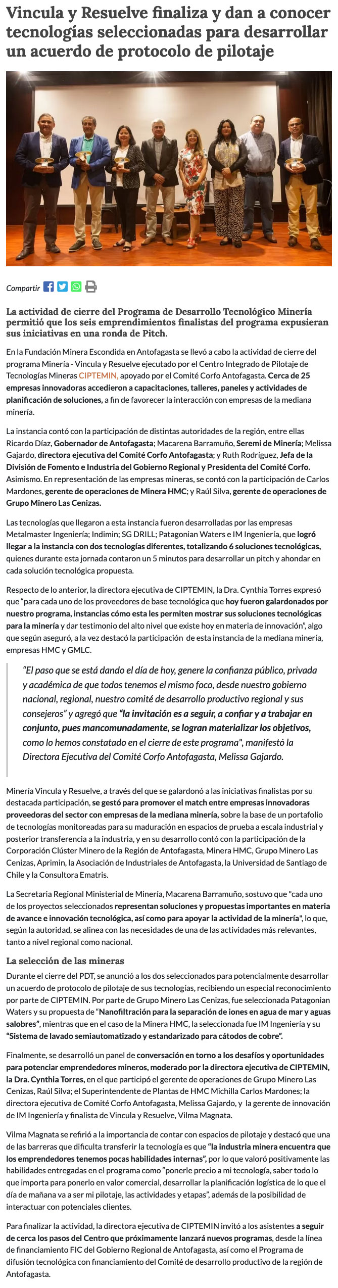 Elegidas por Grupo Minero Las Cenizas y HMC: Vincula y Resuelve finaliza y dan a conocer tecnologías seleccionadas para desarrollar un acuerdo de protocolo y pilotaje - (antofagastanoticias)