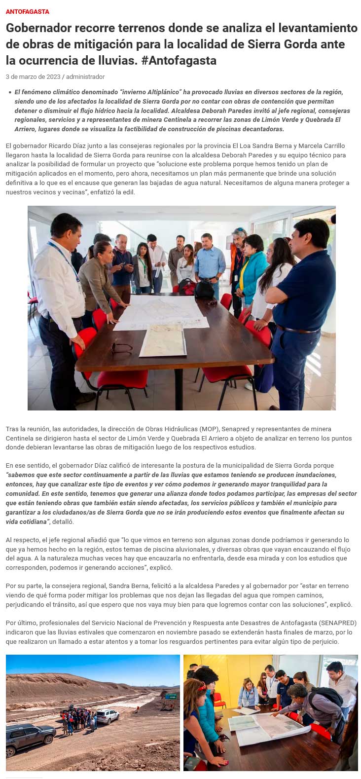 Autoridades analizan obras de mitigación ante la ocurrencia de lluvias en S. Gorda - (El Mercurio de Antofagasta)