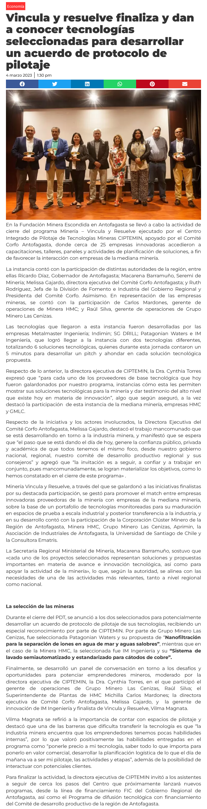 Elegidas por Grupo Minero Las Cenizas y HMC: Vincula y Resuelve finaliza y dan a conocer tecnologías seleccionadas para desarrollar un acuerdo de protocolo y pilotaje - (antofagastanoticias)
