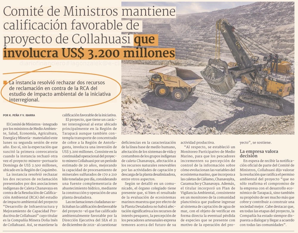 Comité de ministros respalda proyecto de Collahuasi - (El Mercurio de Santiago)