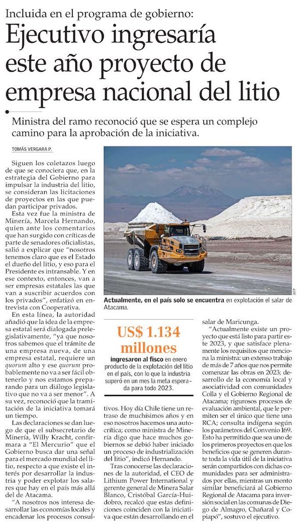 Hernando y las complejidades para una empresa estatal del litio - (La Segunda)