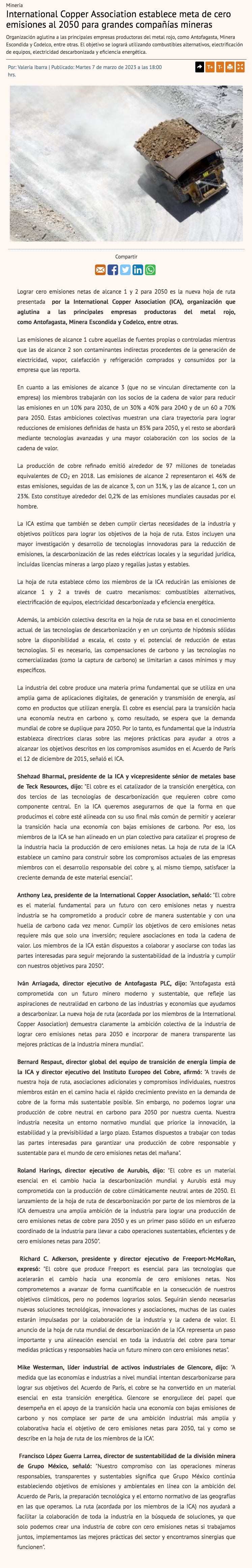 Asociación Internacional de Cobre establece meta de cero emisiones al 2050 para grandes mineras - (Diario Financiero)