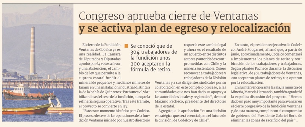 Congreso aprueba proyecto de ley que viabiliza el cierre de la fundición Ventanas - (El Mercurio de Valparaíso)
