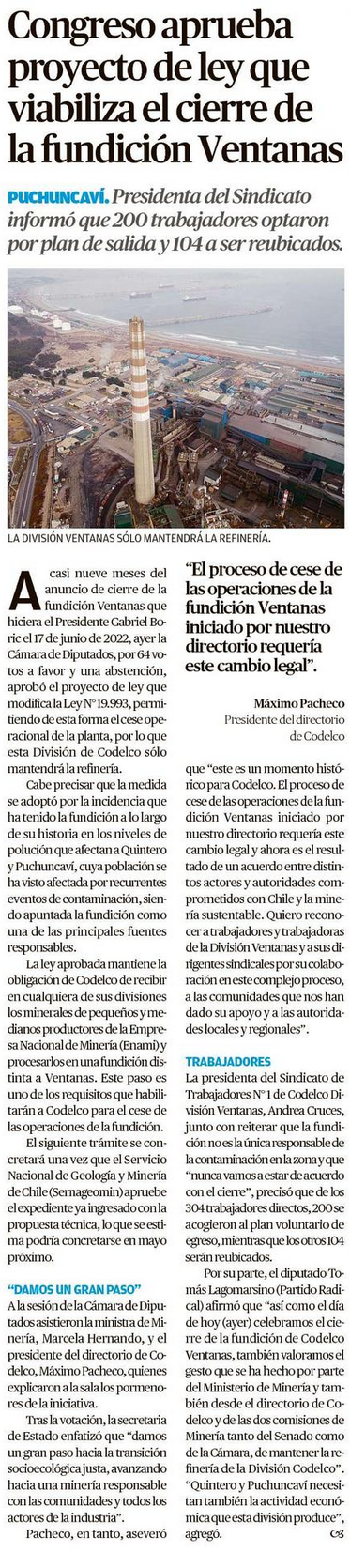 Congreso aprueba cierre de Ventanas y se activa plan de egreso y relocalización - (Diario Financiero)