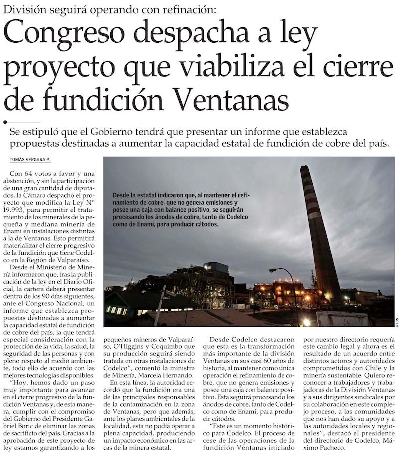 Congreso aprueba proyecto de ley que viabiliza el cierre de la fundición Ventanas - (El Mercurio de Valparaíso)