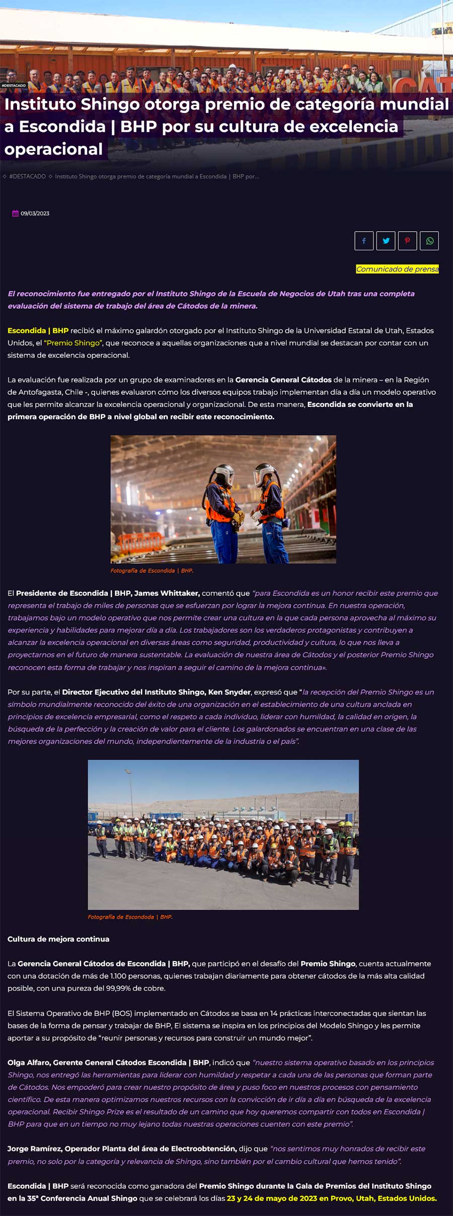 Instituto Shingo entrega galardón a Escondida | BHP por su cultura de excelencia operacional - (mch.cl)