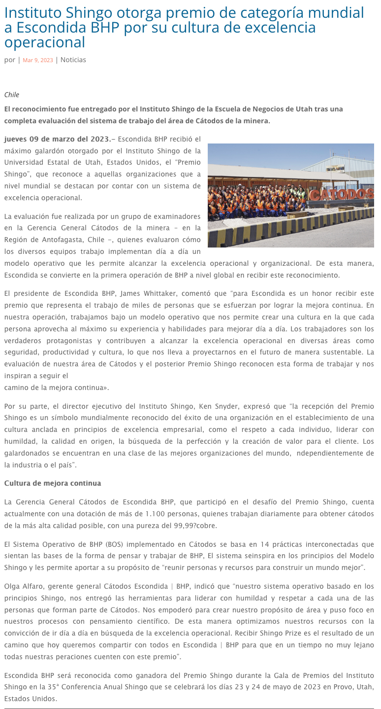 Instituto Shingo otorga premio de categoría mundial a Escondida | BHP por su cultura de excelencia operacional - (coweb.cl)