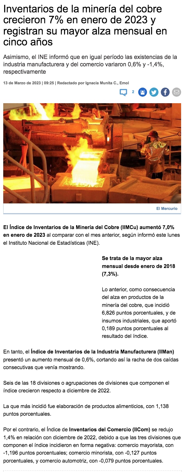 Inventarios de la minerĂa del cobre anotaron un alza mensual de 7,0% en enero - (elperiodista.cl)