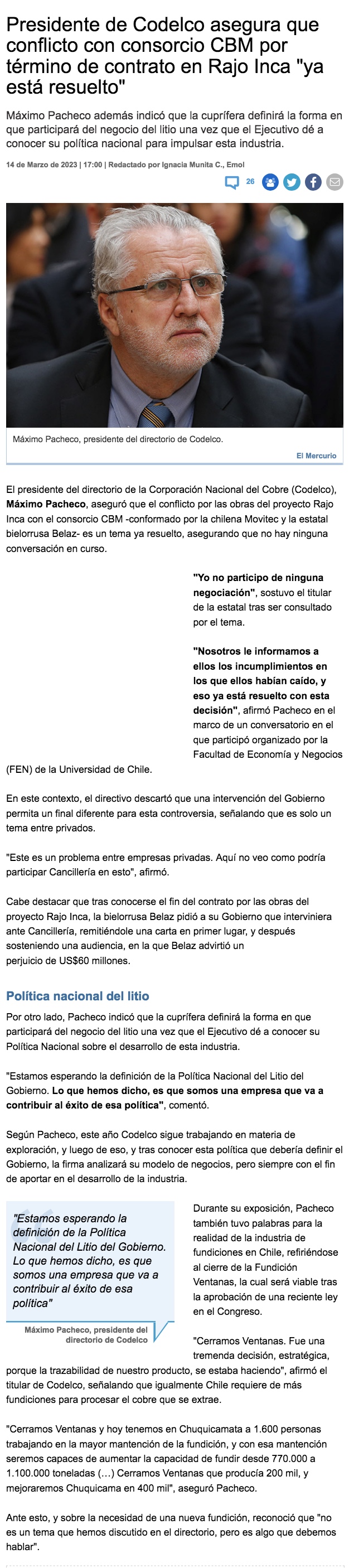 Presidente de Codelco asegura que conflicto por término de contrato en Rajo Inca "ya está resuelto" - (El Mercurio de Antofagasta)