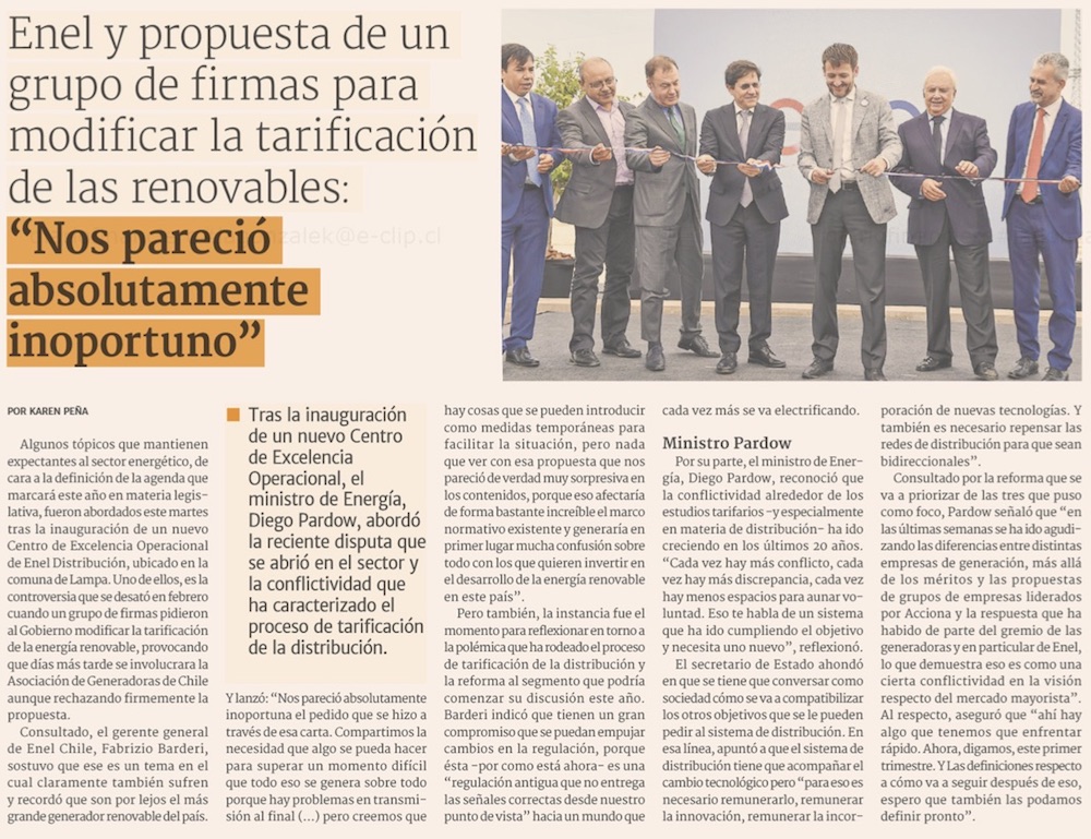 Enel advierte que regulación dificulta transición energética - (El Mercurio de Santiago)