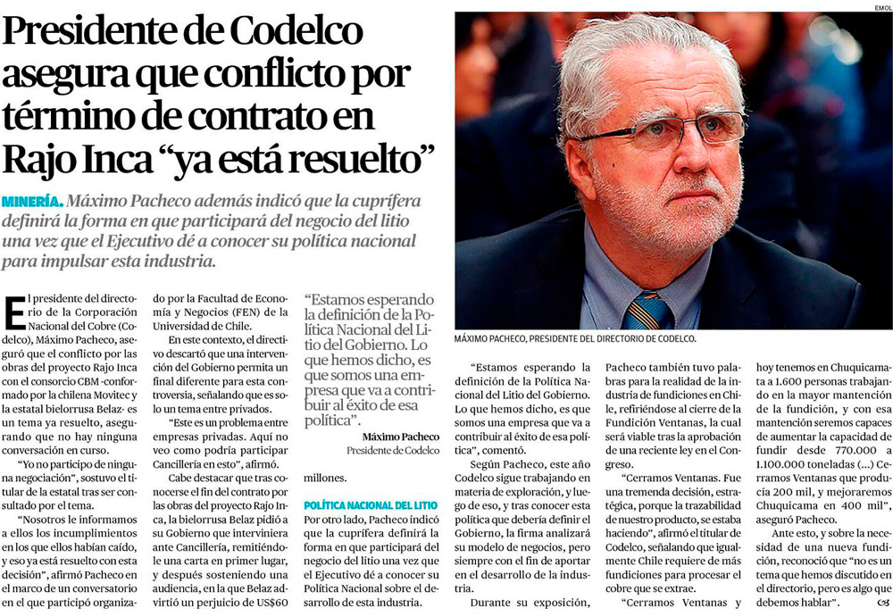 Presidente de Codelco asegura que conflicto con consorcio CBM por término de contrato en Rajo Inca "ya está resuelto" - (emol)