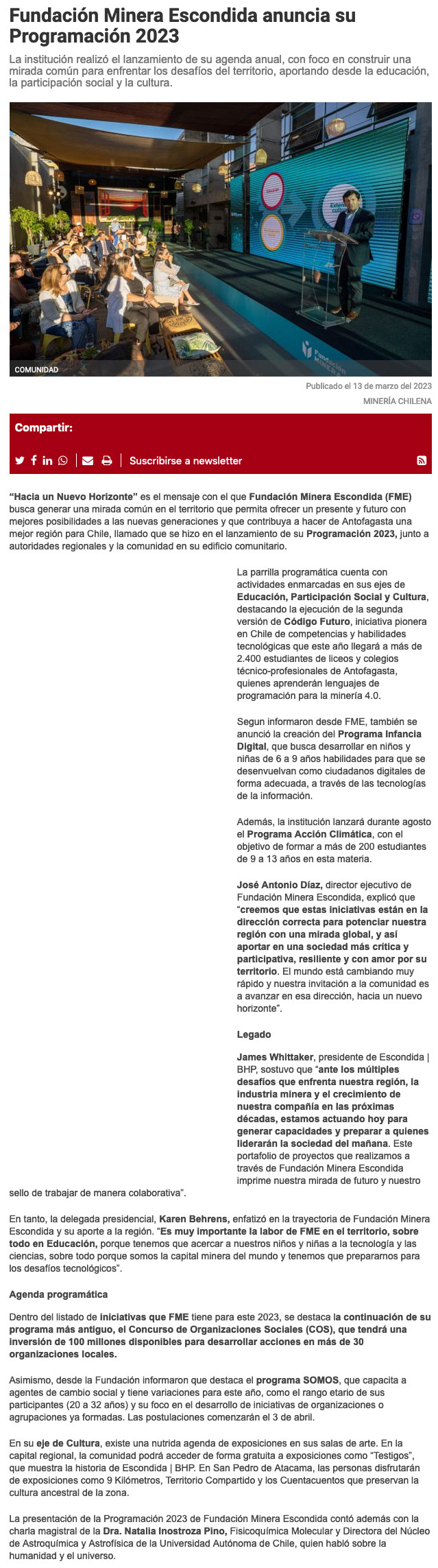 Fundación Minera Escondida anuncia programas Infancia Digital, Código Futuro y Acción Climática en su Parrilla 2023 - (timeline)