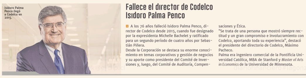 Fallece Isidoro Palma, director de Codelco experto en temas corporativos - (El Mercurio de Santiago)