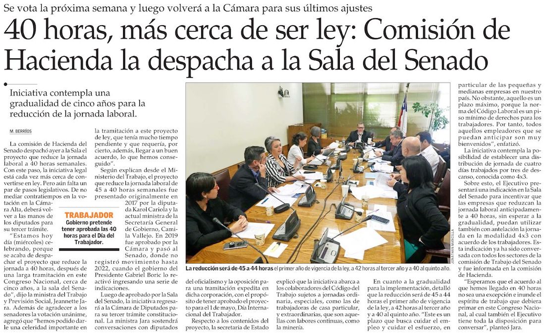 Comisión del Senado despacha a Sala 40 horas y Gobierno da señal a favor de semana laboral de cuatro días - (Diario Financiero)