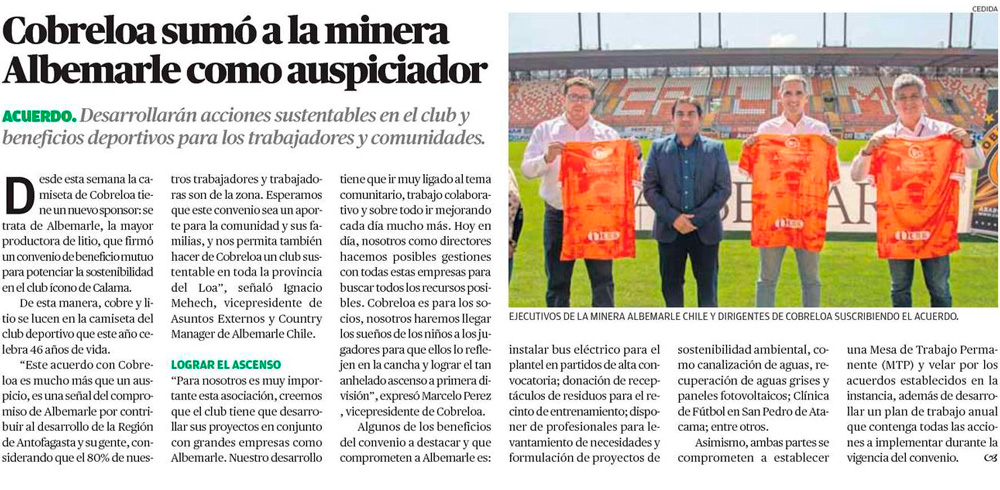 Norteamericana de litio Albemarle serĂ¡ sponsor de Cobreloa - (La Segunda)