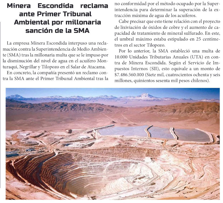Minera Escondida reclama ante el Primer Tribunal Ambiental por sanción de Superintendencia de Medio Ambiente - (antofagastanoticias)