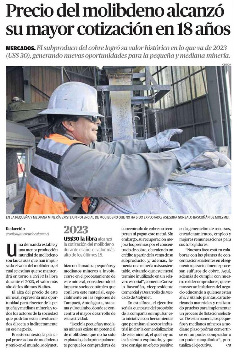 Precio del molibdeno llega a valor histórico, generando nuevas oportunidades para la pequeña y mediana minería - (Estrategia)