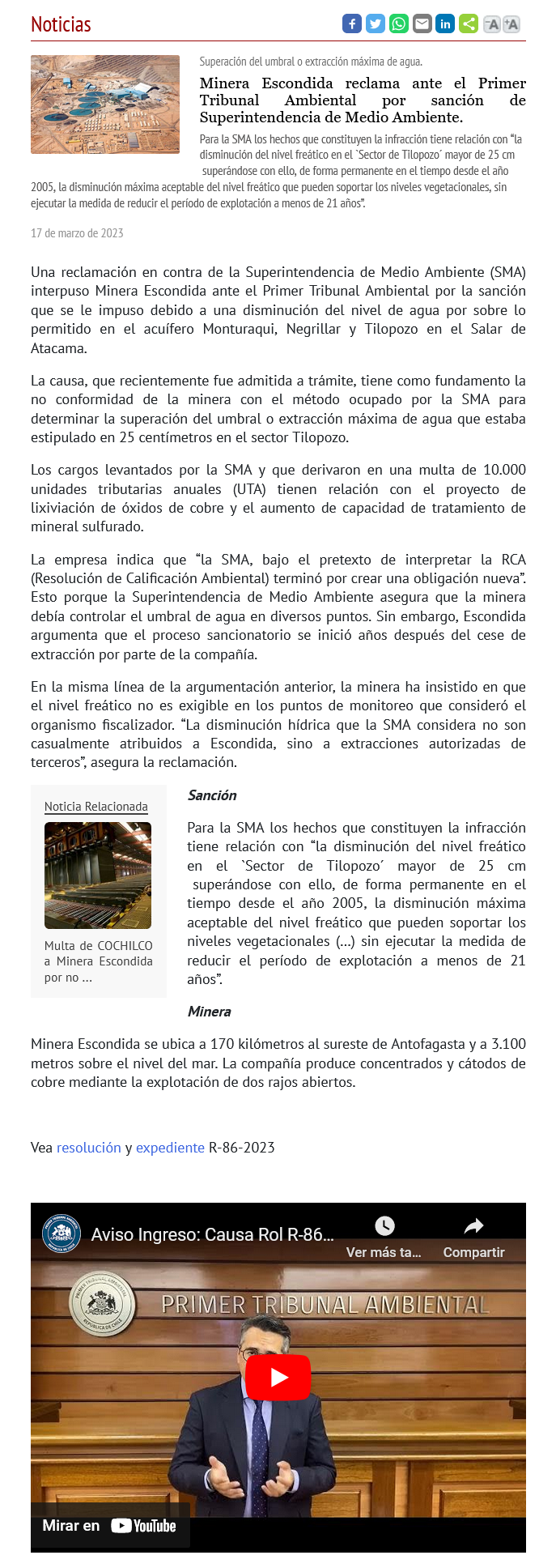 Minera Escondida reclama ante el Primer Tribunal Ambiental por sanción de Superintendencia de Medio Ambiente - (antofagastanoticias)