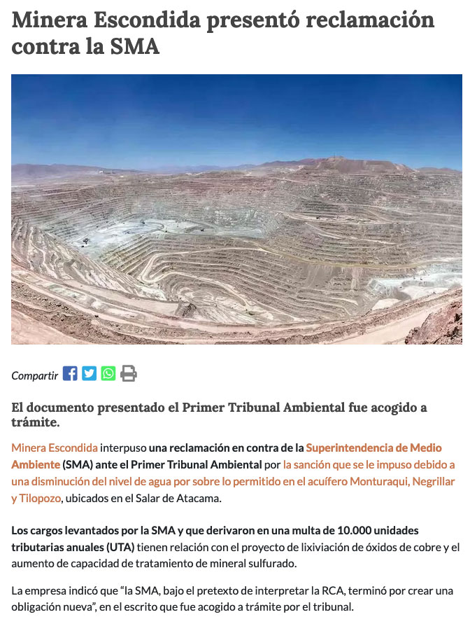 Escondida solicita al Primer Tribunal Ambiental dejar sin efecto multa por casi 7.500 millones - (revistacrisol.cl)