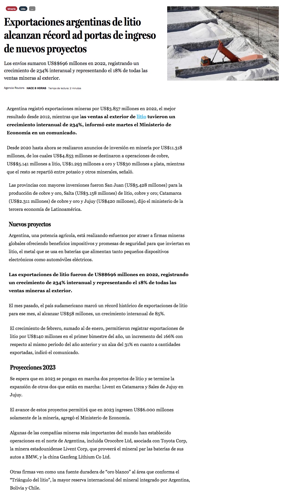 En medio de exportaciones récord, el litio impulsa boom inversiones mineras en Argentina - (bloomberglinea.com)
