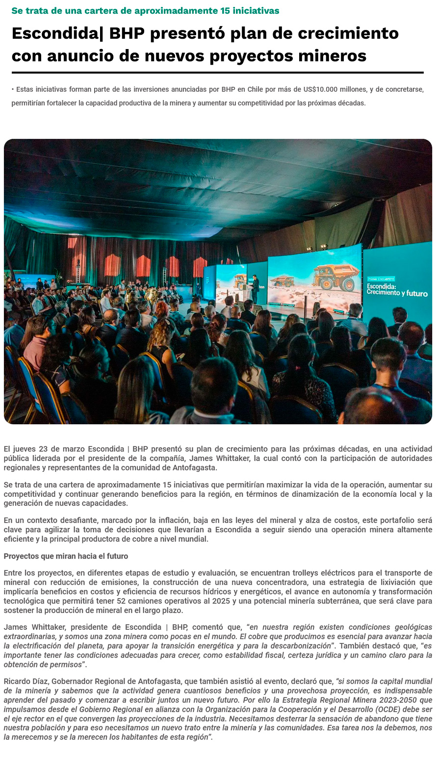 Escondida | BHP presentó plan de crecimiento con anuncio de nuevos proyectos mineros - (coweb.cl)