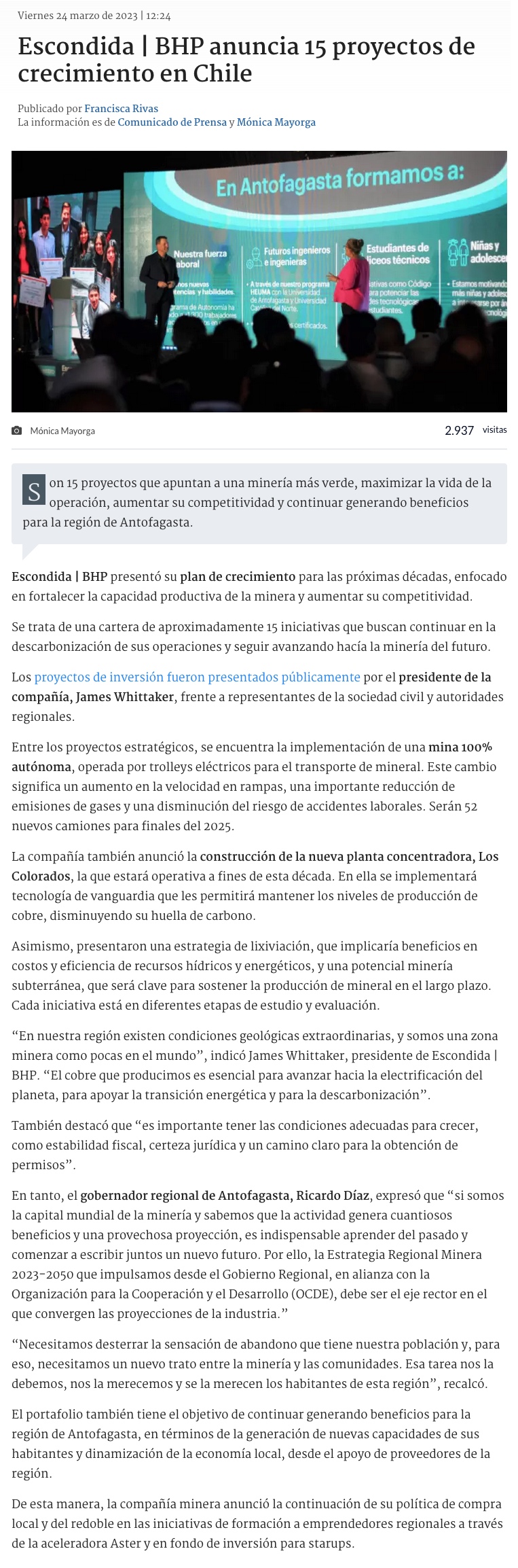 Escondida | BHP presentó plan de crecimiento con anuncio de nuevos proyectos mineros - (coweb.cl)