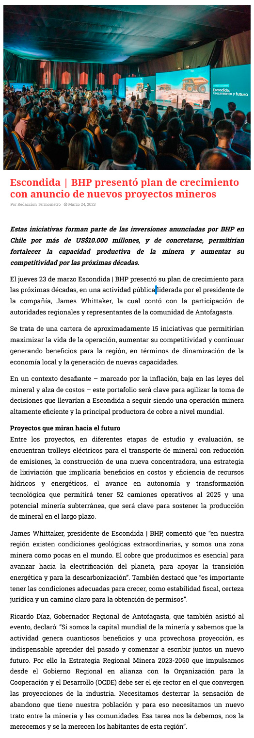 Escondida | BHP presentó plan de crecimiento con anuncio de nuevos proyectos mineros - (coweb.cl)